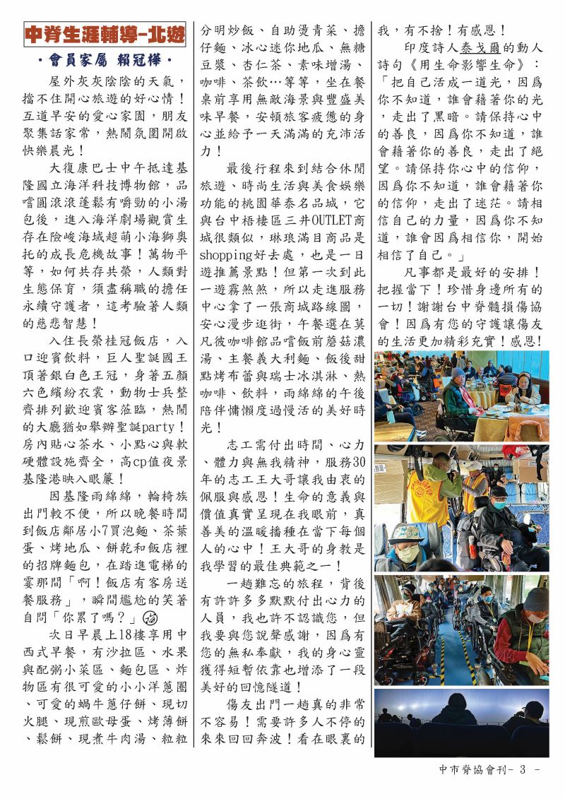 敬愛的朋友平安: 與您分享本會會員及志工參與活動的心得,請惠予撥空參閱,感恩。 本期會刊附上112年9月至113年2月捐贈明細,感謝您長期對我們的熱忱捐助,讓本會能有機會繼續為髓傷友家庭提供更多元化的福利服務。感恩! P.S.煩請協助檢視您的捐贈明細是否正確,如有漏列或需更正,煩請來信或來電通知,再次感謝您的熱忱協助! 敬祝 身體健康 闔家平安 一切順利 社團法人台中市脊髓損傷者協會 敬啟 <中脊113年3月份會刊>1-12頁完整版下載